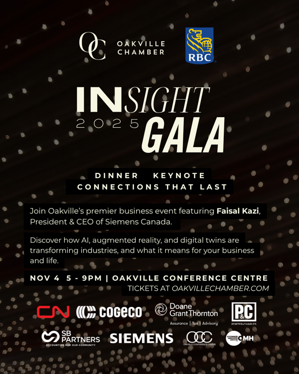 2025 Insight Gala Dinner | Keynote | Connections that last Join Oakvilleās premier business event featuring Faisal Kazi, President & CEO of Siemens Canada.From the energy that powers your home to the trains that move your city, the buildings you work in, and the medical breakthroughs that save lives, technology is dramatically transforming the world around us. Discover how AI, augmented reality, and digital twins are transforming industries, and what it means for your business and life. This event is exclusive for Oakville Chamber members and their guests. Not a member yet? Join online or connect with us at info@oakvillechamber.com to learn more.